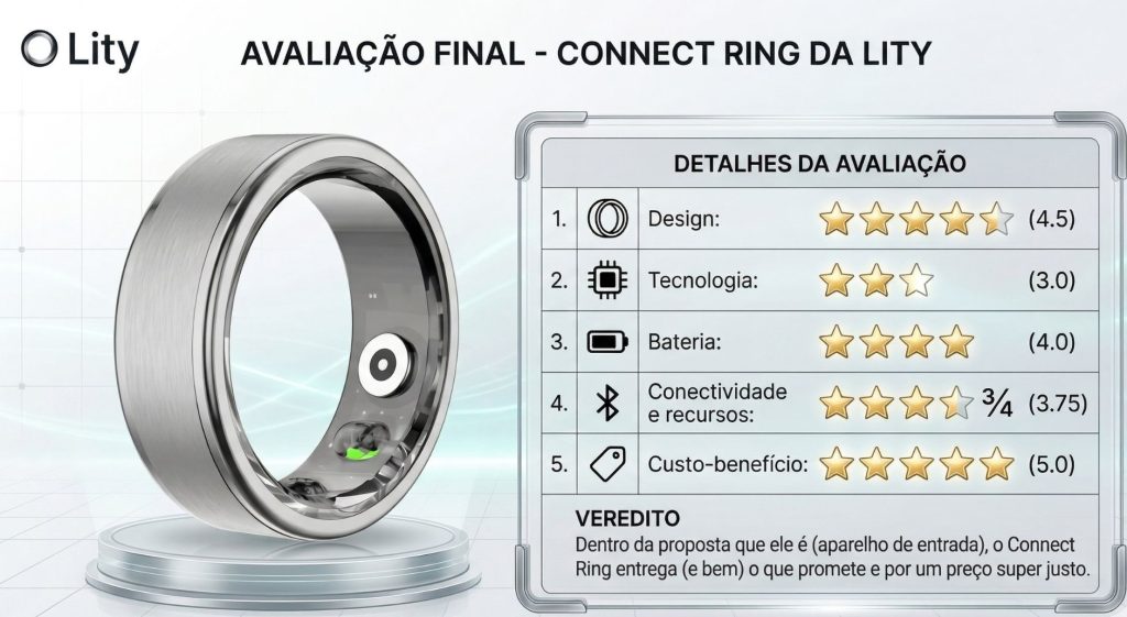 O grande ponto que joga a favor do Connect Ring, da Lity, é que ele não tenta ser mais do que é. Em vez de buscar competir com smartwatches ou wearables mais robustos, o anel aposta em uma proposta objetiva de monitoramento passivo de saúde em um formato quase imperceptível no dia a dia.